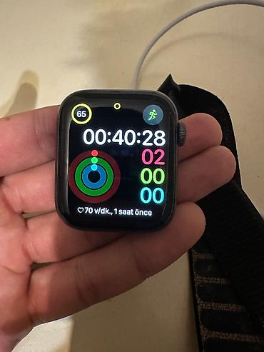 Apple watch 4 44mm 77% pildir. Heç bir problemi yoxdur, kiçik cızıqları var sadəcə. Orjinal Adapter şunuru verilir üzərində