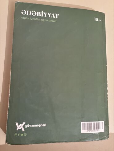 Kitab 2023-cü ilin 3-cü nəşridir və əlavələr edilmiş, təkmilləşdirilmiş bir versiyadır. Təhsil almaq üçün ətraflı məlumatları özündə cəmləşdirən bu vəsait, imtahanlara hazırlıq dövründə abituriyentlərə dəstək olmaq üçün nəzərdə tutulub. Kitabın üz qabığında "ƏDƏBİYYAT" başlığı və "Abituriyentlər üçün vəsait" alt başlığı aydın şəkildə görünür. Arxa üzündə isə "ƏDƏBİYYAT Abituriyentlər üçün vəsait" yazısı və "16m" qiymət etiketi var. "Güvən Nəşrləri" tərəfindən nəşr olunan bu kitab, təhsil materialı kimi faydalıdır. Kitabın arxa tərəfində barkod və "Güvən Nəşrləri" loqosu yer alır.