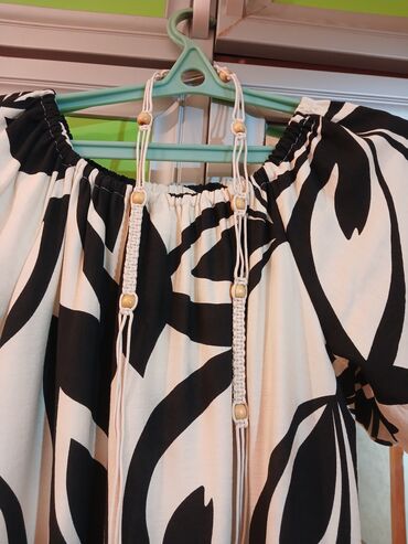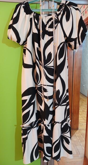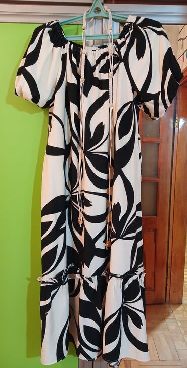QaraAğ və qara rənglərdə böyük abstrakt naxışları olan qadın maksi donu. Donun yaxası açıqdır və çiyinləri açıq qoyur, bu da ona rahat və axıcı görünüş verir. Qısa, həcmli qolları və alt hissəsində zərif büzmələri var. Yüngül materialdan hazırlanıb, gündəlik geyim üçün uyğundur.