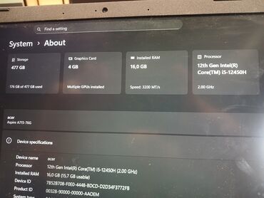 - Prosessor: 12‑ci nəsil Intel Core i5‑12450H (8 nüvə, 2.00 GHz)