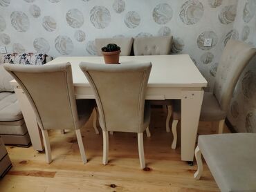 Qeyd: Şəkildə neytral tonlu yumşaq oturacaqlarla uyğunluğu görünür (stullar ayrıca göstərilib). Masanın praktikliyi kiçik məkanlar üçün idealdır – gündəlik kompakt, qonaq qəbulunda isə geniş.