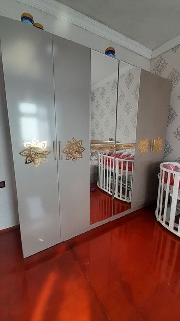 • Qarderob – 6 qapılı, ortası güzgülü bölmə, qızılı dekorativ şablonlar və metal tutacaqlar