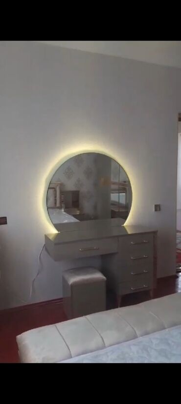 • Tualet masası – geniş iş səthi, ortada çekmece və sağda 4 çekmece bloku; dairəvi LED işıqlı güzgü; uyğun oturacaq taburesi daxil