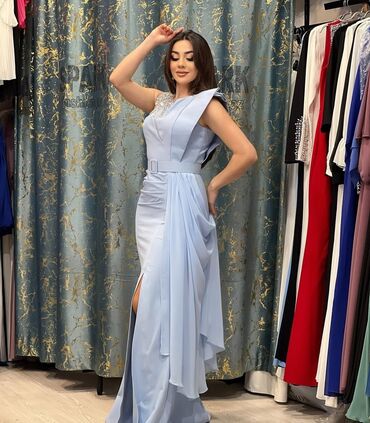- Etek: asimmetrik, yan hissədən qat-qat şifonvari pərdə effekti ilə