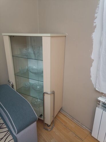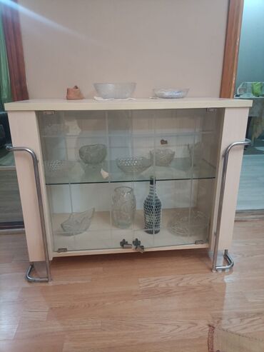 - Üstü geniş olan aşağı vitrin/şkaf: ön hissəsi şüşə qapılı, içəridə bir şüşə rəf var.