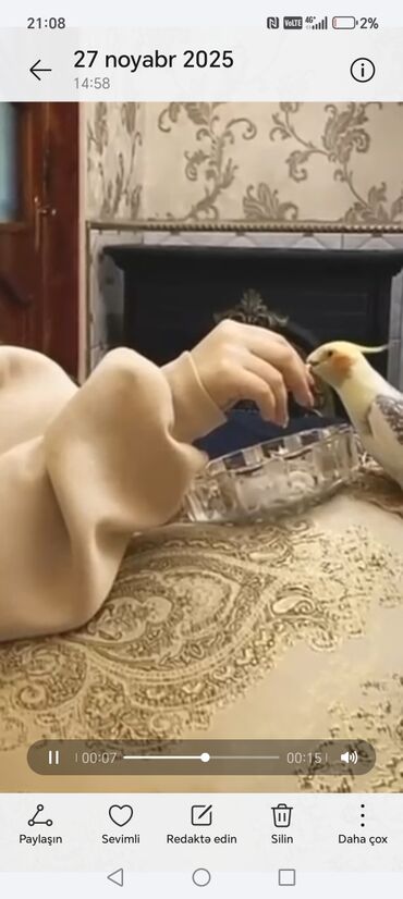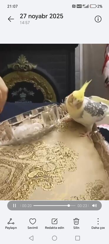 Danişan tutuquşu.Tam əhilləşib, əldən qorxmur. Oğlan quşdur. Çox gözəl danışır, bir çox sözləri aydın şəkildə deyir. Videomuz var — istəsəniz, nömrəyə yazın, sizə videonu göndərək.