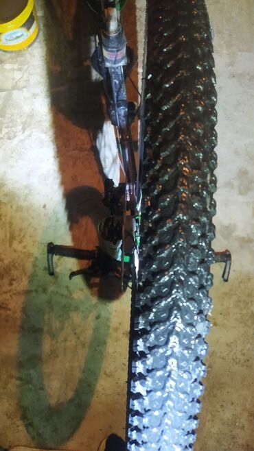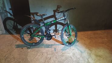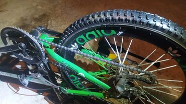Dağ velosipedi – Adidas dizaynlı, yaşıl-qara rəng sxemi problemləri:arxa tormuz tutmur şəkildə olan pedal boşdu sallanır 2 yerdən qaynaq lazımdır