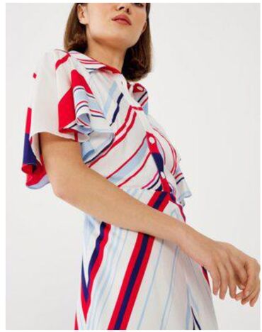 Mavi-ağ naxışlı qadın donu - Üst hissədə iri ağ qoşa yaxalıq - Qısa qol - Aşağıya doğru azca geniş kəsim - Standart razmer - İrisdən alınıb - 2 dəfə geyilib Qiymət: 12 AZN