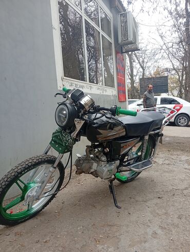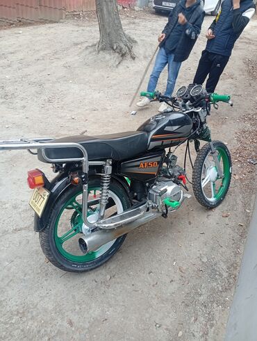 Moped/motosiklet – M50 (80cc) - Mühərrik: 50cc, karbüratorlu, 4 vitesli yarı-avtomat (ayaqla ötürmə). - Gövdə/rəng: Qara gövdə, çən və ön hissə üzərində dekorativ stikerlər. - İşıqlandırma: Ko...