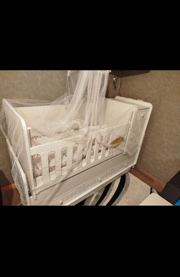 - Klassik dizaynlı ağ beşik, yan tərəfdə çıxarıla bilən‑sürüşən qoruyucu barmaqlıq.