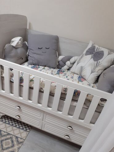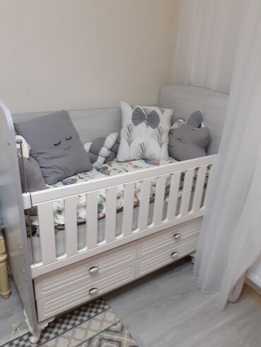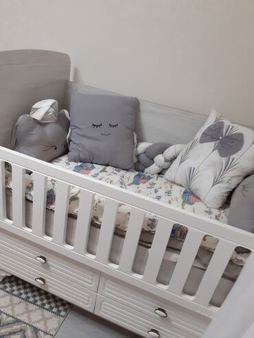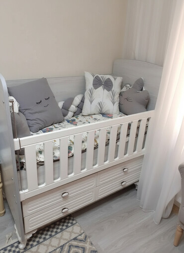 Uşaq beşiyi və döşək dəsti həm qız, həm oğlan üçün dəyişmək olur. Üstündəki nakleykalardı. Çəhrayı fiqurlu tutacaqları da var. - Material: ağ rəngli MDF/taxta konstruksiya, yumru kənarlar, təhlük...