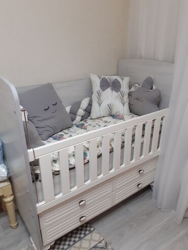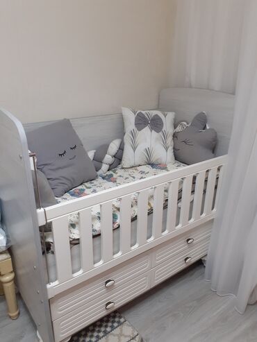 Uşaq beşiyi – ağ rəngdə, çoxfunksiyalı model. Xüsusiyyətlər: - Yan lövhəsi sürüşdürülərək yuxarı‑aşağı qaldırılır: asan giriş və təhlükəsiz yatış üçün. - Yumşaq, dalğalı baş‑ayaq hissələri; hava d...