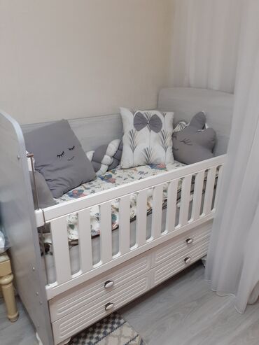 Uşaq beşiyi – çarpayı və komodlu modul - Rəng: ağ-boz - Material: MDF/taxta kombinasiyası - Sağ tərəfdə sürüşdürülərək açılıb-bağlanan təhlükəsizlik barmaqlığı (yuxarı-aşağı tənzimlənir) - Sol his...