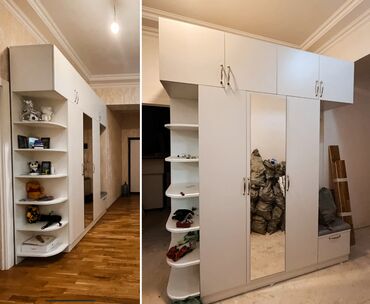 Ölçülər təxmini (şəkillərə görə): yüksəkliyi tavanadək, genişliyi bir neçə moduldan ibarət bütöv divar sistemi. Modul yerləşimi solda açıq rəflər, mərkəzdə güzgülü qapılar, sağda oturacaq və çekmece, yuxarıda boydan-boya şkaflardır.