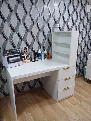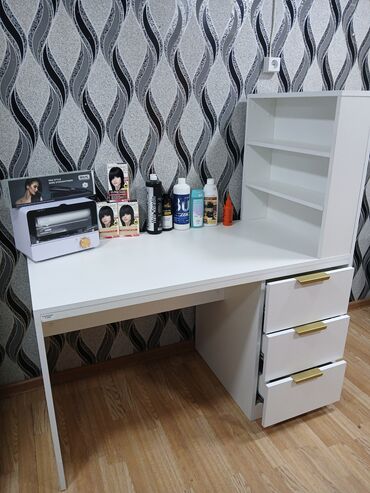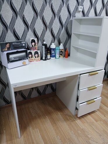 Ölçülər şəkillərə əsasən: standart geniş iş masası formatı; sağ blok masanın altında, rəf bloku üst səthdə yerləşir.