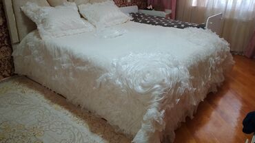 Ağ rəngdə, zərif dizaynlı yataq örtüyü dəsti _ Yenidir hec istifade edilmeyib yastiq uzleride var zamoklu 2 boyuk 1 balaca .unvan 20 yanvar - Material: parıltılı atlas-saten və nazik şifon qatları...