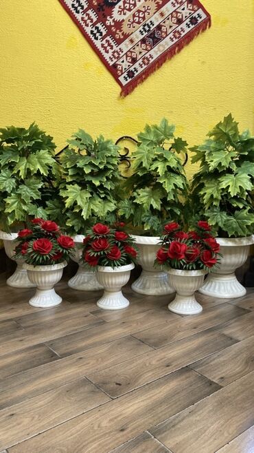 Rənglər: qırmızı güllər, yaşıl yarpaqlar, ağ dibçəklər.