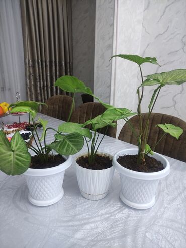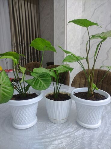 - Üç ədəd Syngonium saksı bitkisi. Yarpaqlar ox formalıdır, açıq-yaşıl və zolaqlı naxışlıdır.