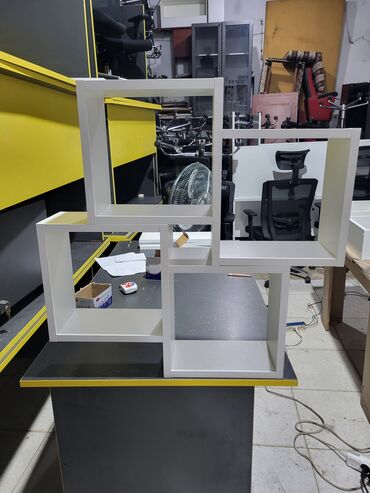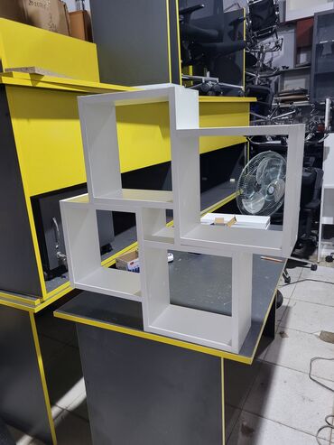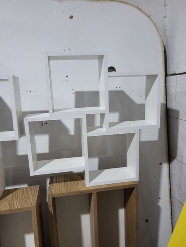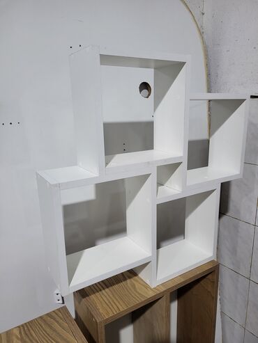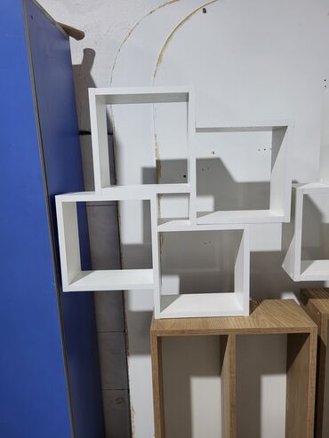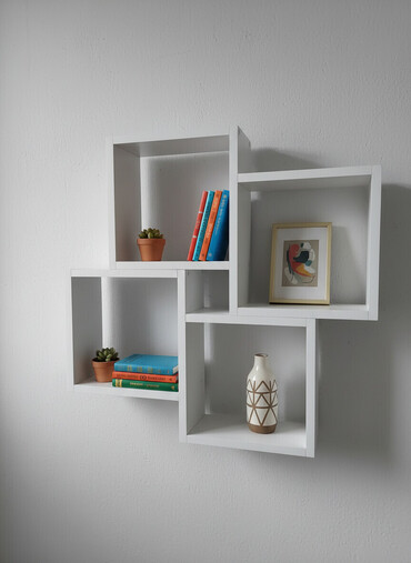 Ağ rəngli divar rəfi – modul dizayn - Material: ağ laminat - Dizayn: bir-biri ilə kəsişən 5 kvadrat/ düzbucaqlı bölmədən ibarət asimmetrik kompozisiya - İstifadə sahələri: qonaq otağı, yataq otağı...