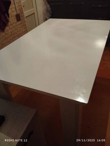Ağ rəngli yemək/iş masası - Minimalist dizayn: düz, geniş üst səth və sadə, möhkəm ayaqlar - Parlaq laminat/MDP tipli üst səth rahat təmizlənir - Düzbucaqlı forma – mətbəx, yemək otağı və ya iş kü...