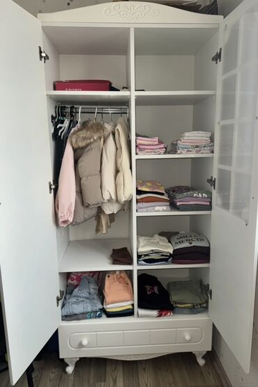 - Sol bölmə: yuxarıda rəf, altında paltar asma üçün metal boru, ən altda geniş yer
