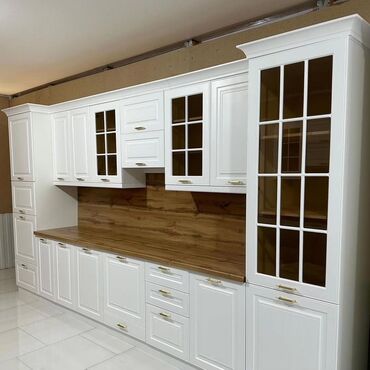 Klassik estetika və funksionallığı birləşdirən, saxlama həcmi bol olan mətbəx mebeli həlli. Rəf və vitrinalar qab-qacaq nümayişi üçün, geniş iş səthi isə gündəlik bişirmə üçün uyğundur.