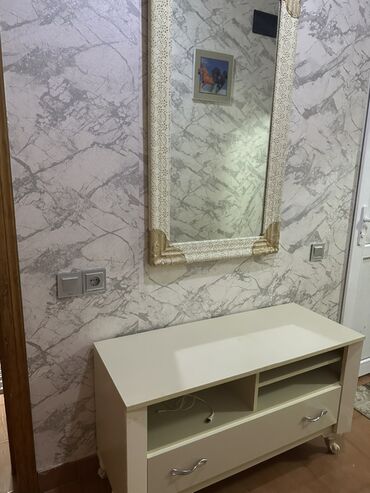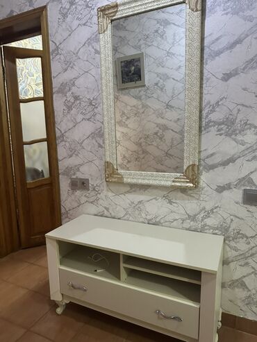 - Material: MDF/taxta əsaslı quruluş, metal tutacaqlar; güzgü divara asıla bilən konstruksiyadadır.