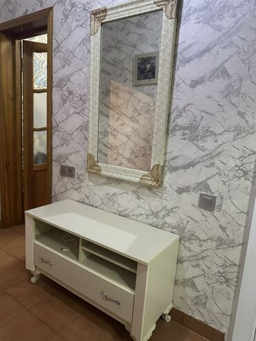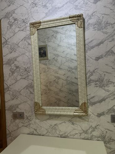 - Güzgü: iri ölçülü, düzbucaqlı forma. Krem rəngli, naxışlı çərçivə və qızılı bəzək küncləri ilə interyerə klassik zəriflik qatır.