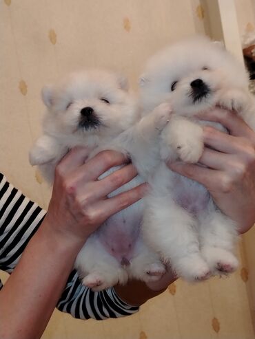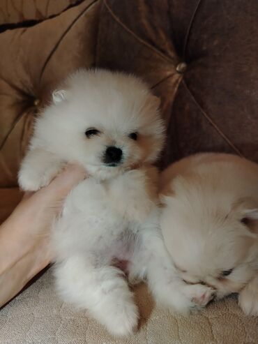 Ağ, tüklü balaca Spitz/Pomeranian tipli iki balaca it balası. Xüsusiyyətlər: - Rəng: krem-ağ - Çox sıx, yumşaq ikiqat yun örtüyü - Kiçik gövdə quruluşu, qısa pəncələr, tünd gözlər - Qısa, tüklü qu...