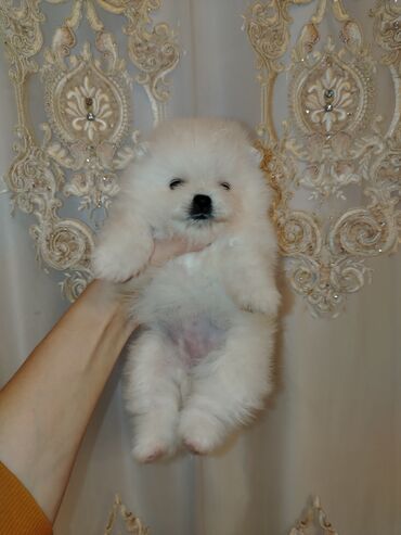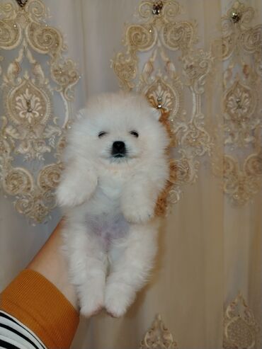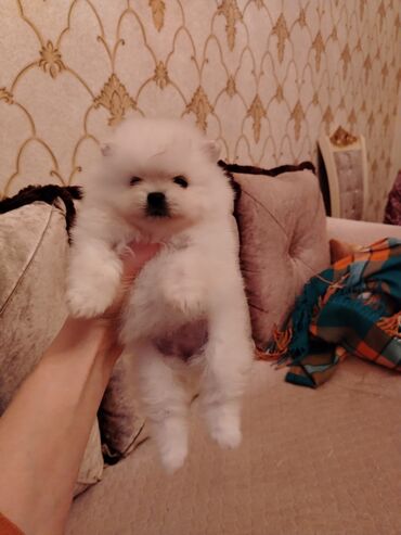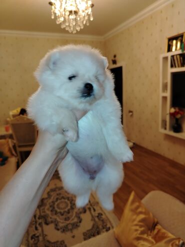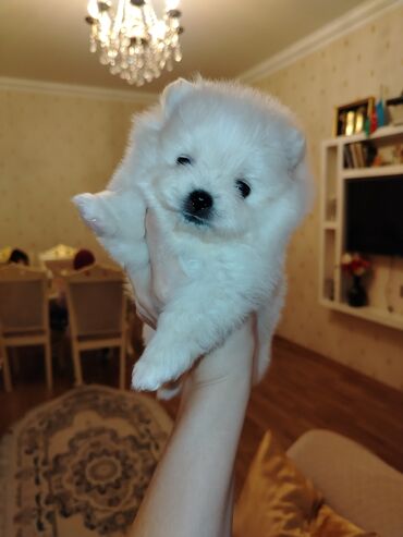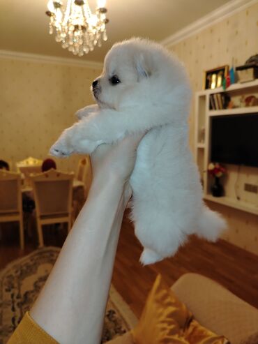 Pomeranian (Spitz) balası - Rəng: qar kimi ağ - Yunu: çox sıx, ipək kimi yumşaq, qalın alt tüklü - Burnu: qara, kiçik və yumru - Qulaqlar: balaca, dik formaya keçəcək - Gözlər: tünd, ifadəli - Bəd...