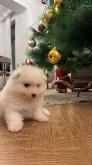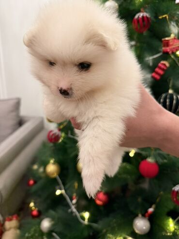 Pomeranian (Spitz) balası - Rəng: qar kimi ağ - Yunu: çox sıx, ipək kimi yumşaq, qalın alt tüklü - Burnu: qara, kiçik və yumru - Qulaqlar: balaca, dik formaya keçəcək - Gözlər: tünd, ifadəli - Bəd...