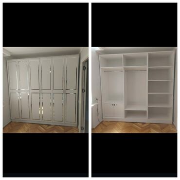 Şəkillərdə göstərilən nümunələr: üçqapılı güzgülü şkaf, tam divar boyu çoxqapılı qarderob və iç planı (asılqanlar, rəflər, alt dolablar).🛋️🛏️🪑Komfortun və keyfiyyətin tək űnvani "M. M. Mobilya"