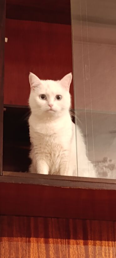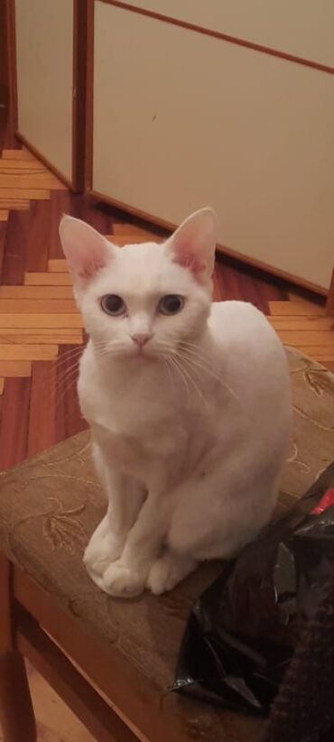 Ağ, qısa tüklü ev pişiyi - Tam ağ rəngli, parlaq tüklər - Yaş: balaca/yeniyetmə (fotolarda görünür) - Yaşıl zəngli çəhrayı boyunluqla gəlir - Sakit və mehriban görünüşlü, ev şəraitinə uyğun - Düz q...