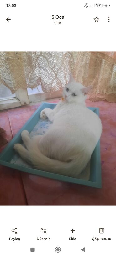 Turkis angor cins pişik ELANI DİQQƏTLƏ OXUYUN! Dişidir Qurd dərmanı verilib, peyvənd olunub. 4 aylıqdır. Həqiqətən yaxşı baxa biləcək aileye verilir, uşaqlı aileler narahat etmesin. Oyuncag evezi a...