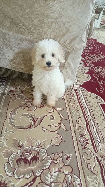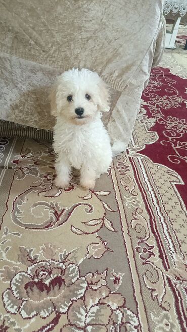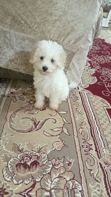 Ağ, qıvrım tüklü, kiçik ölçülü it balası.