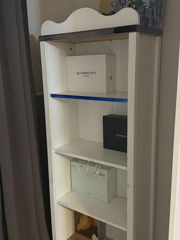 Kitab/akessuar rəfi - Model: açıq rəf + alt qapalı dolab - Material: laminat/MDFlam - Rəng: ağ korpus, rəflərdə çəhrayı kant; alt hissə taxta teksturalı qapılar - Ölçü təxmini: 180 sm hündürlük, 8...