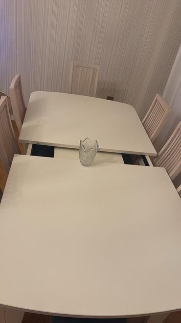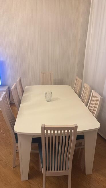 Açılabilən yemək masası və 8 ədəd stul dəsti - Masa: ağ rəngdə, zərif kənar işləmələri və dördkünc forma. Ortadan genişlənən (açılma) mexanizmə malikdir – əlavə panel masanın içindədir. - Ayaqlar:...