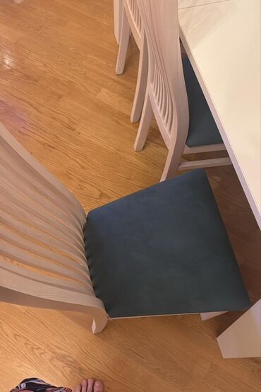 6 nəfərlik yemək otağı dəsti - Masa: taxta teksturalı üst səth, düzbucaqlı forma; möhkəm ayaqlar; neytral tonda korpus. - Oturacaq sayı: 6 ədəd. - Kreslolar: yumşaq parça üzlüklü, bel hissəsində d...800 AZN
