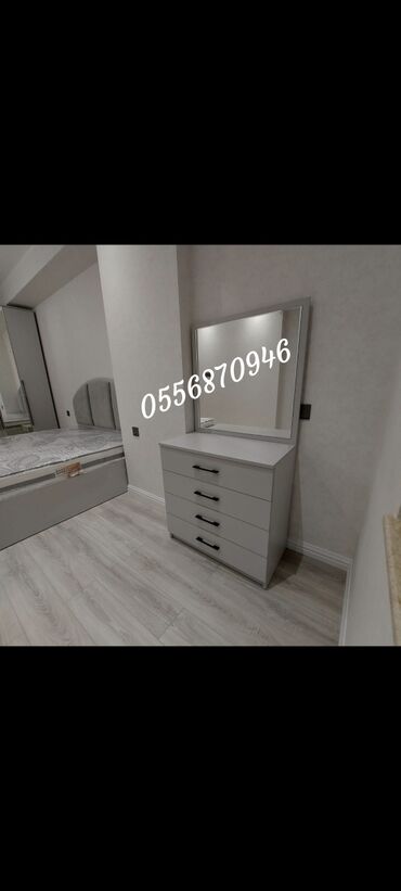 - Tualet masası versiyası: iri çərçivəli güzgü, 4 çekmece, kompakt yataq otağı yerləşimi üçün uyğun.