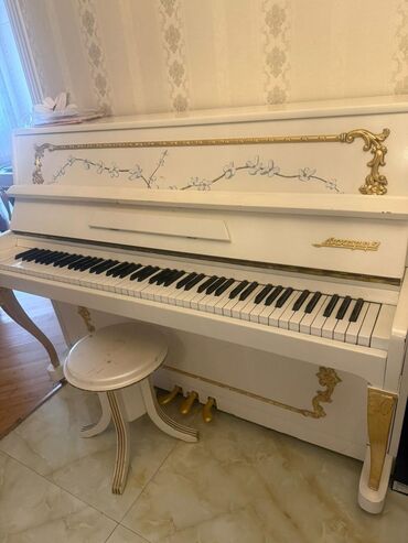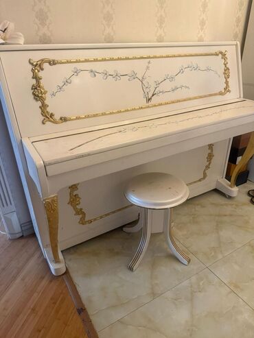 Ağ rəngdə, klassik üslubda şaquli pianino. - Korpus: ağ lak örtük, qızılı dekor elementləri və üzərində zərif çiçək naxışları - Klaviatura: tam ölçülü, 88 klaviş - Pedallar: 3 ədəd - Ön paneldə və...