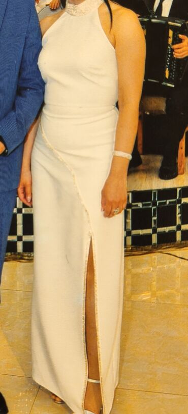 Ağ rəngdə, uzun ziyafət paltarı. Yarıqlı yan hissədə şaquli yarıq və