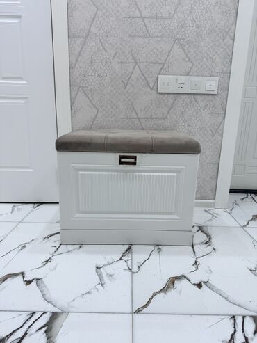 - Komplektdə oturacaqlı ayaqqabıqutusu/benç: üstündə yumşaq parça oturacaq, ön tərəfdə dekorativ panel və daxilə açılan saxlama bölməsi