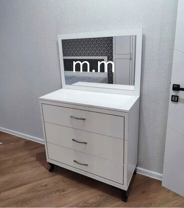 - Geniş güzgülü dresser: 3–4 dərin çekmece, üst hissədə iri çərçivəli güzgü