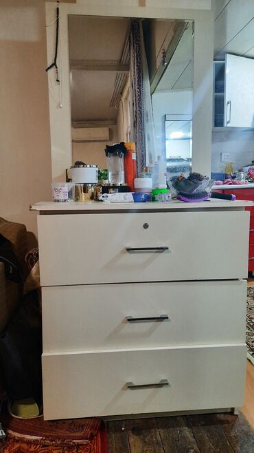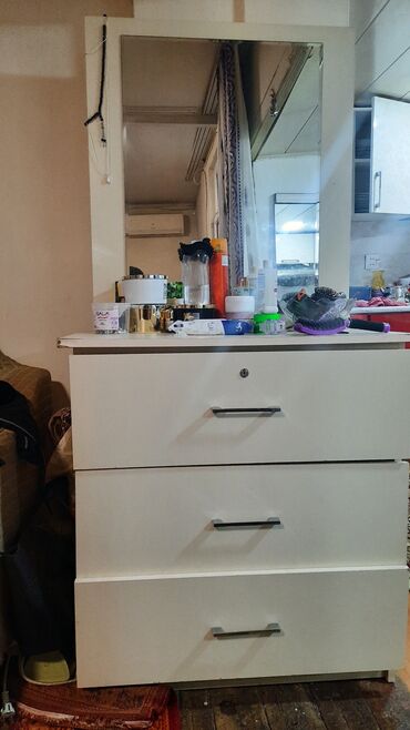 Az istifadə olunmuş makiyaj masası satılır ✨ Ölçülər 1.00×1.60×0.42 Ümumi vəziyyəti görünüşü əladır. Qiymət: 180 AZN, real alıcıya endirim ediləcək 💸 Krem rəngli tualet masası/komod dəsti - Üst h...
