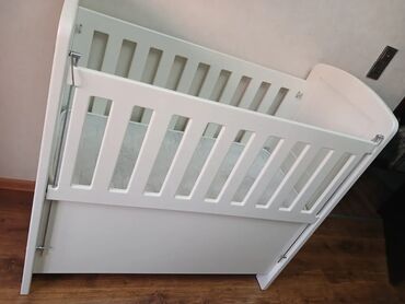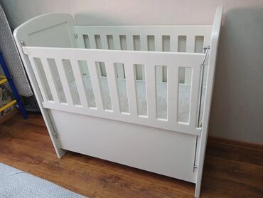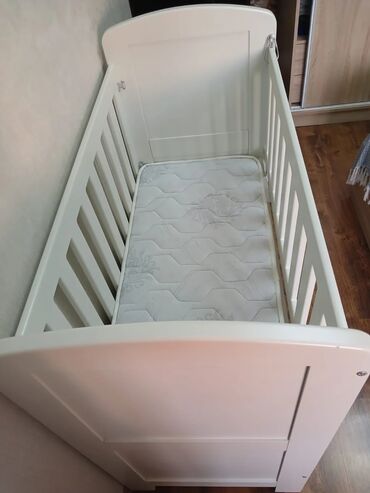 Uşaq beşiyi – klassik dizayn - Rəng: ağ, qızılı dekor elementləri ilə - Material: ağac/MDFlam görünüşlü korpus, önlükdə şaquli barmaqlıq - Ön tərəf: sürüşən relsli qoruyucu barmaqlıq (yuxarı-aşağı...