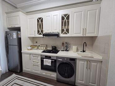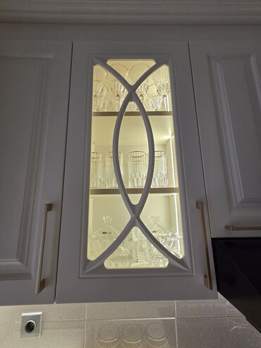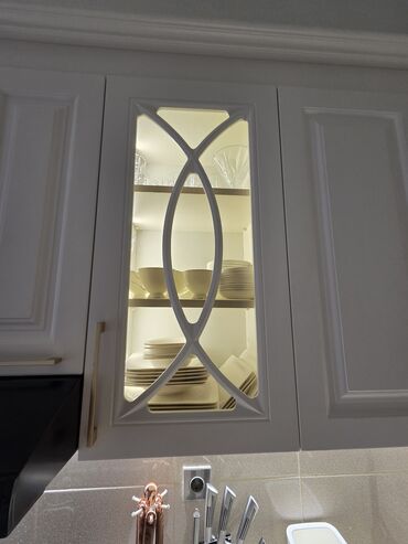 - Klassik dizaynlı ağ rəngli mətbəx garnituru: yuxarı-aşağı şkaflar, şüşəli vitrin qapıları, qızılı tutacaqlar, tağlı-karnizli üstlük.