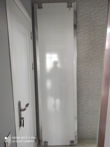 Ağ rəngli sürüşmə şkaf qapılar. 3. denesi 135man - Material: parlaq ağ MDF/laminat panel - Kənarlar: xrom rəngli alüminium/profil çərçivə - Mexanizm: yuxarı-aşağı bələdçi və rulonlar üçün montajlı ...