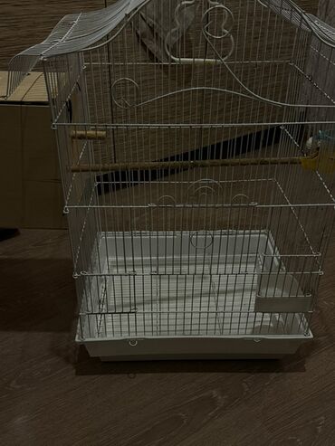 Ağ rəngli metal quş qəfəsi və aksesuarları