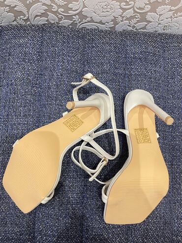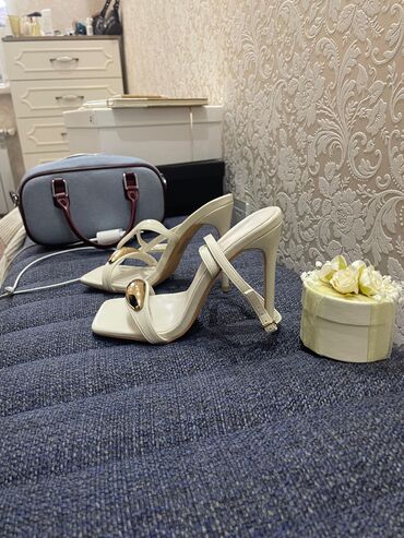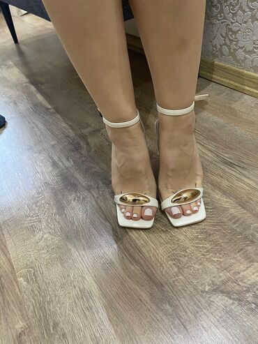 Bej rəngli qadın sandaľ – kvadrat burunlu, nazik qayışlı, açıq dizayn. - Yüksək daban: təxminən 8–9 sm, saat şüşəsi formasında stabil konstruksiya - Yumşaq yastıqlı içlik, ayaq üstünü iki nazik qay...
