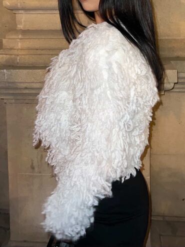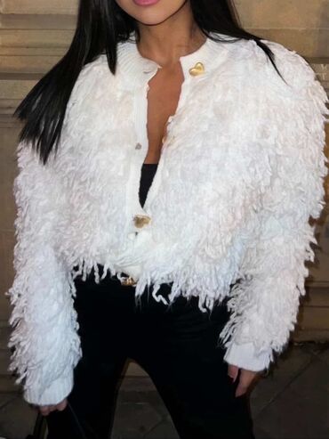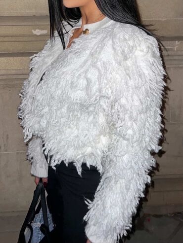 - Dizayn xüsusiyyətləri: həcmli və isti görünüş verən tüklü/loop-knit faktura, aşağı kənarlarda yüngül dalğalı kəsim